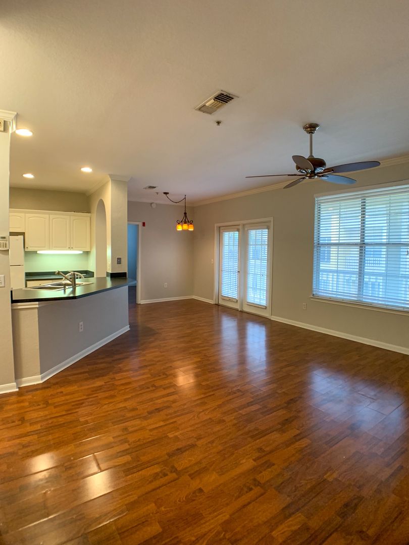 This 2 bedroom 2 bath condo unit is located in downtown Orlando. It's located on the 4th floor and has a view of the pool courtyard. The unit has all new paint on all the walls, doors, and trim. The unit has wood floors throughout with tile in both bathrooms. Full size laundry is included in this unit. Lot's of natural light. This is a must see!! We have two pools on property, a business center, great room, and a large gym with all free weights on one side and cardio on the other. Pet friendly community with 2 dog parks on property. Secure parking within the gated parking garage. Water, sewer, trash, & pest control are all included with your rent.
